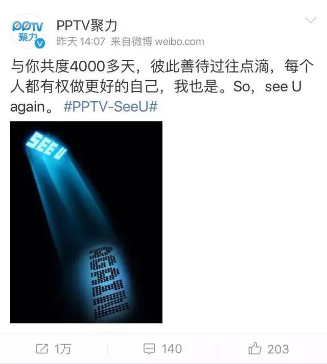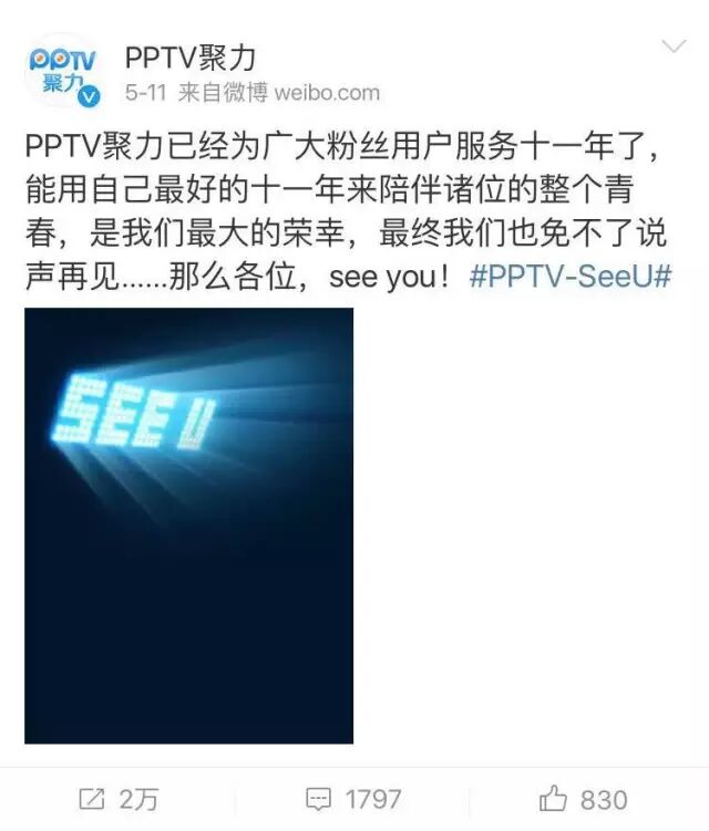 这种模式之前也有类似的套路,5月11日下午,视频播放平台PPTV聚力发布了一条微博,宣称在为粉丝服务了十一年后,要和粉丝说再见了。