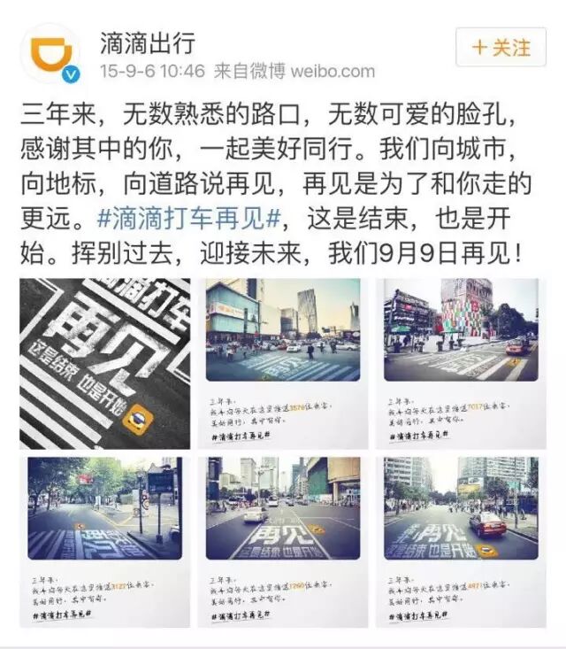去年9月,滴滴出行(原滴滴打车)也在微博上放出了一系列跟粉丝说再见的主题海报,在随后几天的发布会上,当时的滴滴打车正式宣布更名为滴滴出行。