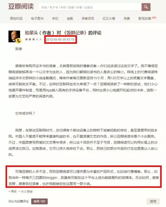 ▲ 这是和菜头在豆瓣发布电子书《饭醉记录》的时候,在评论里写下的一段致谢词,和今天的情况似乎有些不谋而合。