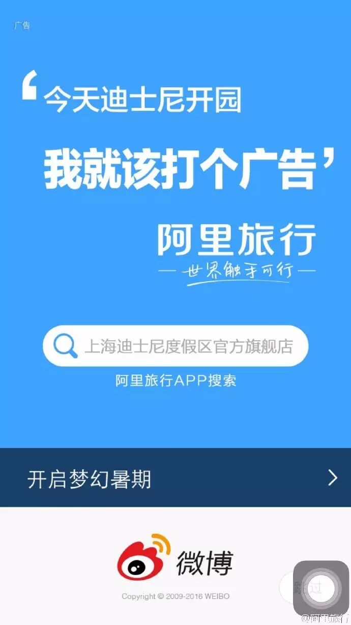 另外,阿里旅行同时投放了微博开机屏幕广告,任性风格依旧,广告语为“今天迪士尼开园,我就该打个广告”。