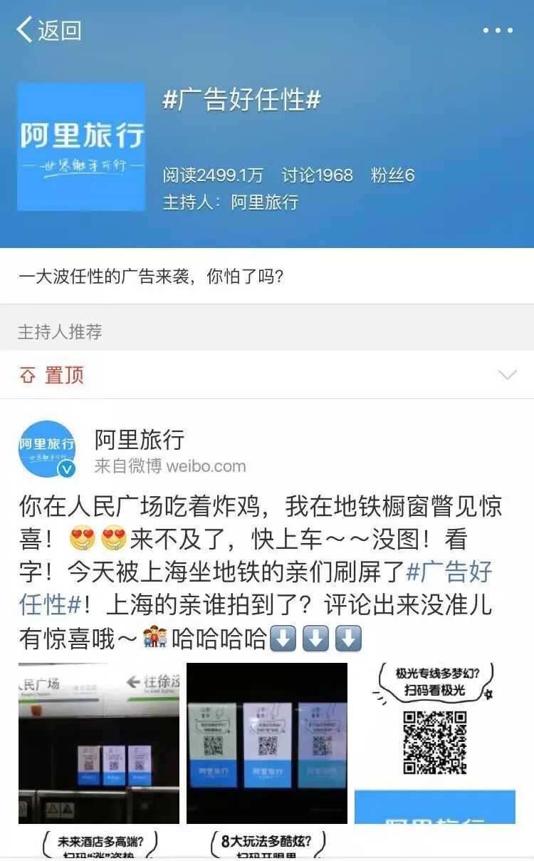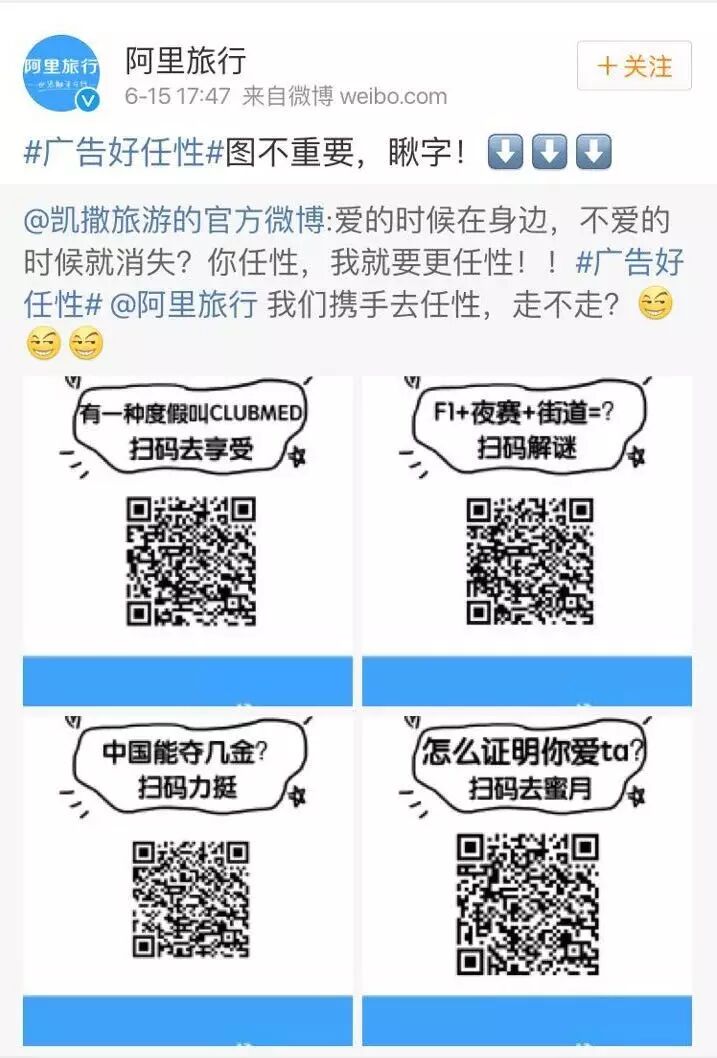 新榜:这次阿里旅行在微博上发起了一波“任性广告”,用简单直白的二维码形式进行推广,一共联合了多少个酒店、旅游品牌?