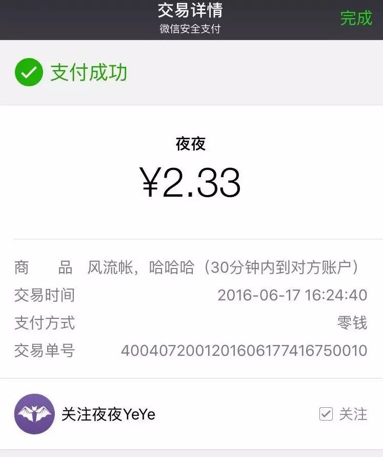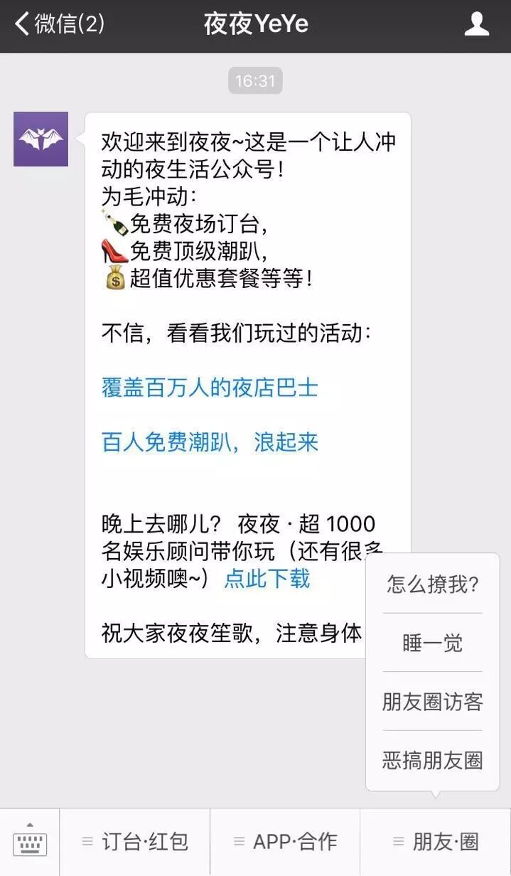 这款H5由“夜夜App”开发推出,支付成功以后,系统将提示关注公众号“夜夜YeYe”,而在这个公众号底部的菜单栏中,就有这款H5的链接,关注后的自动回复语也相对露骨。