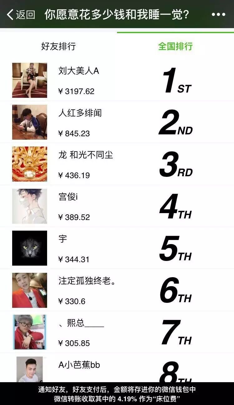 从该H5的全国排行显示看,排名第一的用户“刘大美人A”已获得超过3000元收入,而排名第二的“人红绯闻多”收入800多元。
