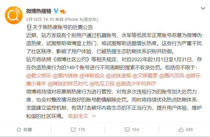 新榜讯 2月18日,微博发布《关于刷热度账号的处置公告》称,因个别用户通过机器账号、水军等低质非正常账号恶意为微博伪造热度,试图帮助微博登上热门,或试图帮助话题增长热度,微博决定对自2022年起1月1日至1月31日,存在伪造热度行为的149个账号进行不同周期的搜索不收录处罚。