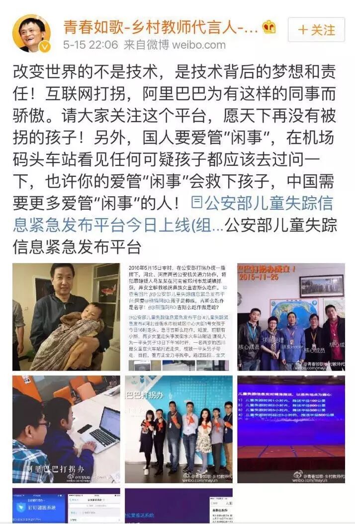 5月15日,马云发布微博,表达了阿里巴巴作为一家大企业肩负互联网打拐的义务。为了适应“互联网+反拐”的时代要求,建立儿童失踪信息发布的权威渠道,发动群众搜集拐卖犯罪线索,公安部刑事侦查局打拐办在阿里巴巴公司的技术支持下,开发了儿童失踪信息紧急发布平台。并且,这个平台的官方账号成为了马云关注的第一个微博账号。马云的这条微博,获得了近两万转评和近三万点赞。