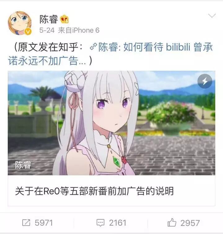 5月24日晚,陈睿现身知乎,回答了用户的质疑,陈睿表示,出现贴片广告的是《Re:从零开始的世界》《火影忍者》《双星之阴阳师》《百武装战记》《Pripara 3rd 美妙天堂 3》五部新番。而原因是由于日本版权方方面的要求,迫于合同必须执行。同时,陈睿把这份说明以头条文章的形式发布在了个人微博上。陈睿向用户保证,“B站未来有可能会倒闭,但绝不会变质”。