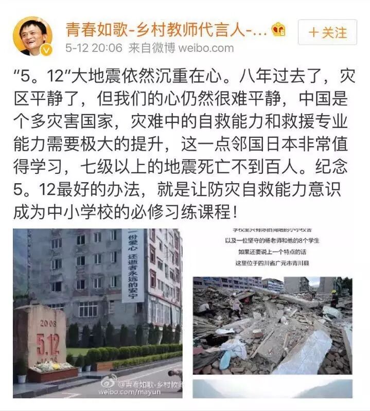 5月,惜字如金的马云还发布了另一条微博,那就是纪念5.12汶川大地震八周年。马云发布了阿里公益的一篇长文《512 | 又一个7年之约:青川在变,我们也在变》,展示了青川的变化,以及阿里巴巴公益团队所做的努力和贡献。这条微博同样获得了2万多点赞。