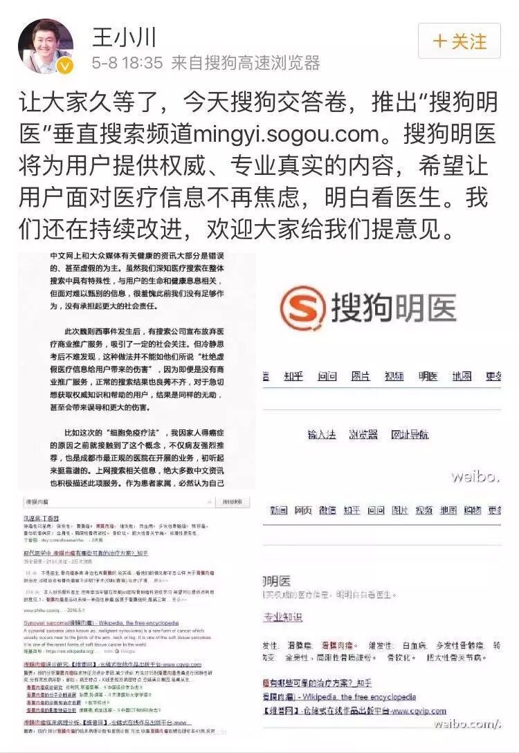 5月初,百度魏则西事件引发搜索行业巨变,占市场份额不少的搜狗顺势推出新招。5月8日,搜狗CEO王小川发布公开信,正式发布搜狗的新产品 “搜狗明医”。王小川还强调,作为一家技术驱动的公司,搜狗将“不作恶,不作秀”。当用户发起与医疗相关的搜索请求时,搜狗搜索将优先展示非商业的、真实、权威的医疗信息,并引导进入搜狗明医频道。