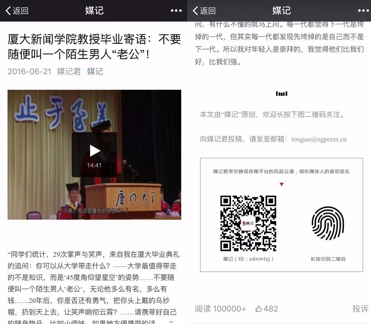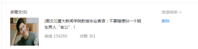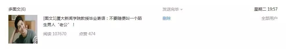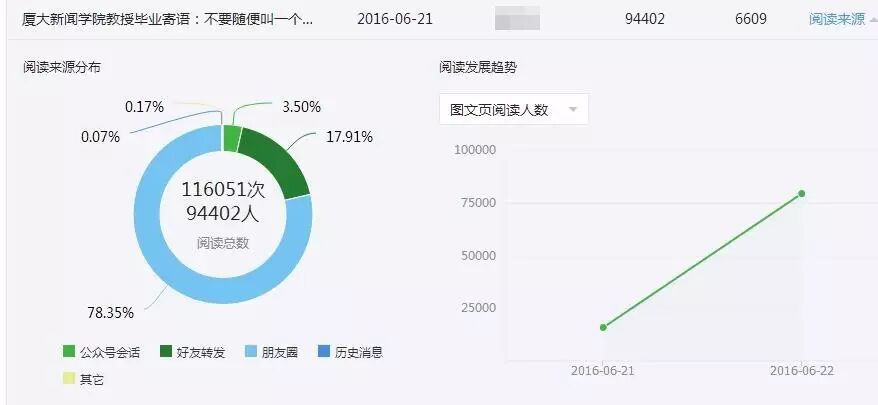 聊起《厦大新闻学院教授毕业寄语:不要随便叫一个陌生男人“老公”!》这篇的10万+,媒记君用“跌宕起伏”4个字形容。“昨天下午有个历史性的时刻,微信的数据统计突然奔溃,一开始我还不知道,就只看到阅读量翻倍了从7万多一下子涨到15.4万多,一下超兴奋。”
