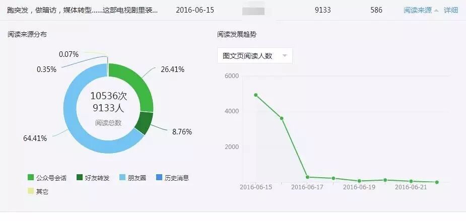 以“媒记”的非爆款图文数据对比。6月15日,“媒记”发布《跑突发,做暗访,媒体转型……这部电视剧里装满了纸媒人的酸甜苦辣》,7日总阅读人数为9133,总分享人数为586。阅读来源占比前三分别为朋友圈64.41%、公众号会话26.41%、好友转发8.76%。阅读发展趋势图呈现逐步下降,发布后第三日阅读量下降最剧烈,经媒记君确认,该图与日常其他图文的趋势图近似。