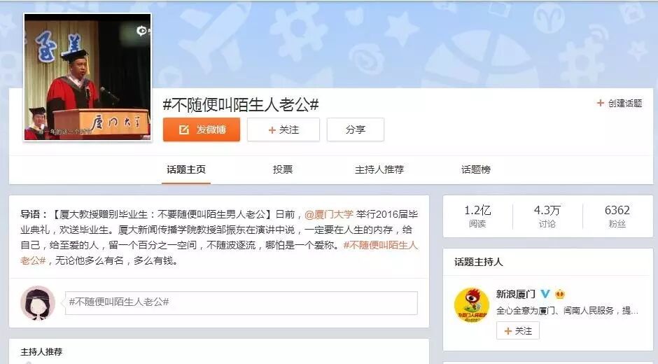 登上微博热搜,微信讨论文章多篇10万+,门户网站纷纷发文评论……厦门大学新闻传播学院教授邹振东也许从没想过,他在厦大毕业典礼上说的这句“不要随便叫陌生人老公”能火这样,变成热门话题。