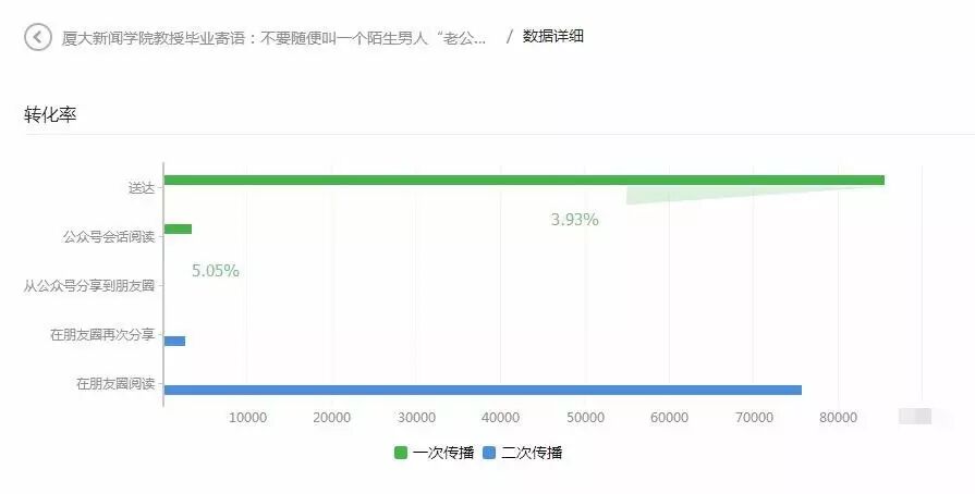 根据该文的转化率数据,公众号送达后直接点开产生的2日阅读总量仅3366,占总阅读量3.56%,不足5%,这其中仅170人将图文转发到朋友圈,以上是一次传播产生的效果数据。通过朋友圈阅读到该文后,再分享的人数达到2701人,在分享人数中所占比例较高,通过朋友圈二次分享阅读图文的人数达到75674,占阅读人数的最大比例。这也意味着该文主要通过二次传播产生阅读量,也就是在“不要随便叫一个陌生男人老公”这个话题再社交平台爆热后,用户才对该文产生关注,并开始疯狂转发阅读,这也能解释为什么阅读量在发布后次日爆增。
