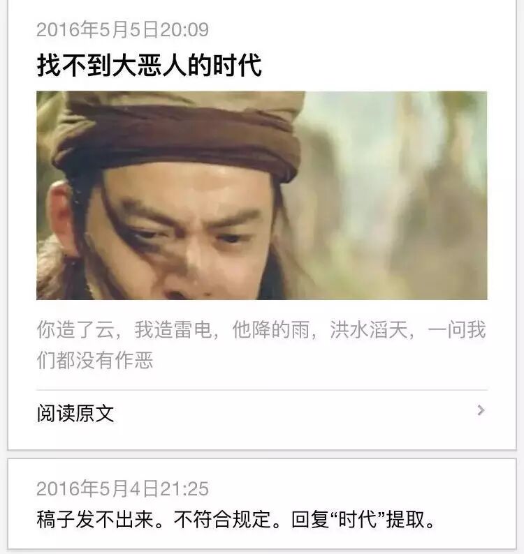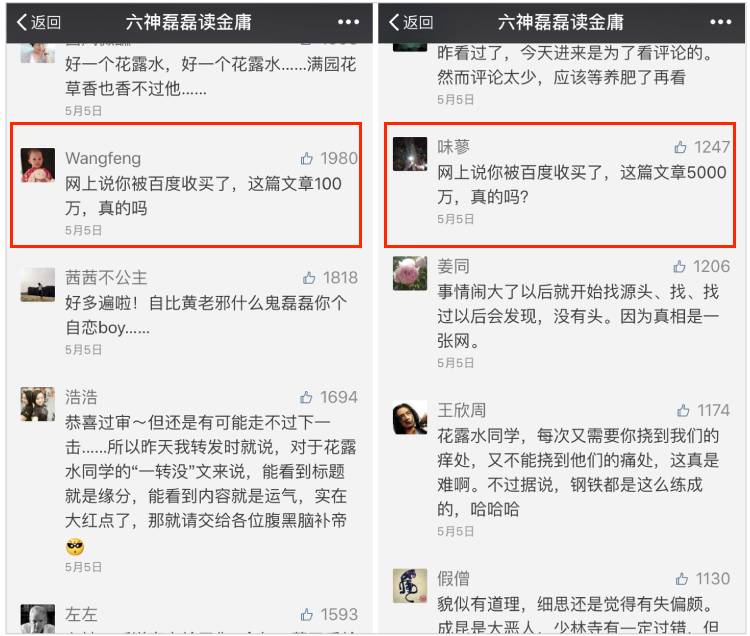 而就在这风口浪尖之上,5月5日,六神磊磊发布文章《找不到大恶人的时代》,文章提出“干掉百度,首恶就伏法了吗?”的怀疑,暗指百度并不是此事背后真正的“大恶人”。这篇文章其实在5月4日就已经写完了,但最初并没有通过微信的审核,六神磊磊唯有通过自动回复的形式发布,但第二天还是通过了审核,阅读数自然很快突破了10w+。