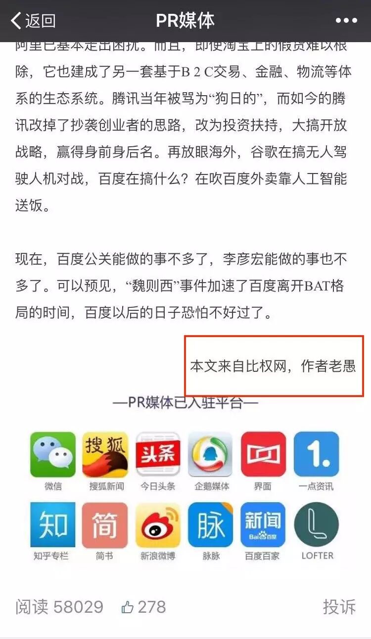 不过,据新榜向“PR媒体”负责人赵宏民求证,当时《这届百度公告真不行,洗地“魏则西”事件的手段全被捅出来了》一文,也并非“PR媒体”原创,而是转载了原作者“老愚”的文章,这一点,在此文的末尾也有简单说明。