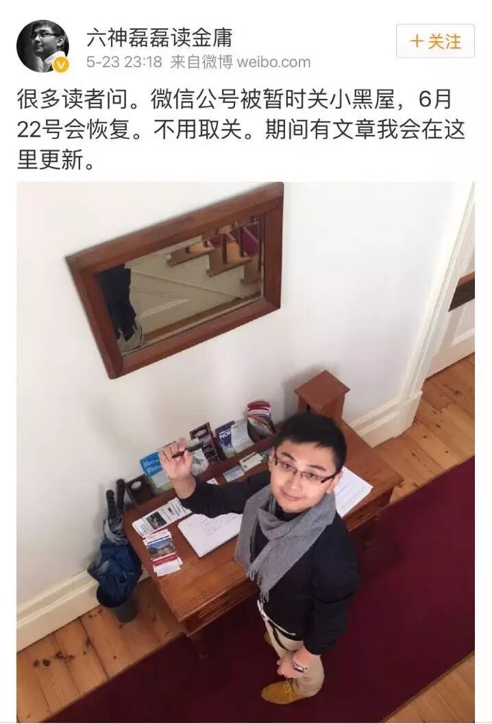 6月21日晚11点左右,一个月前被封号的“六神磊磊读金庸”正式解封,结束被闭关修炼。这个由前新华社记者王晓磊创办的微信公众号,在5月22日发布了一篇《星宿派的公关为什么搞不好》的文章,随即被微信官方封号一个月,而这篇文章也在之后被删除。