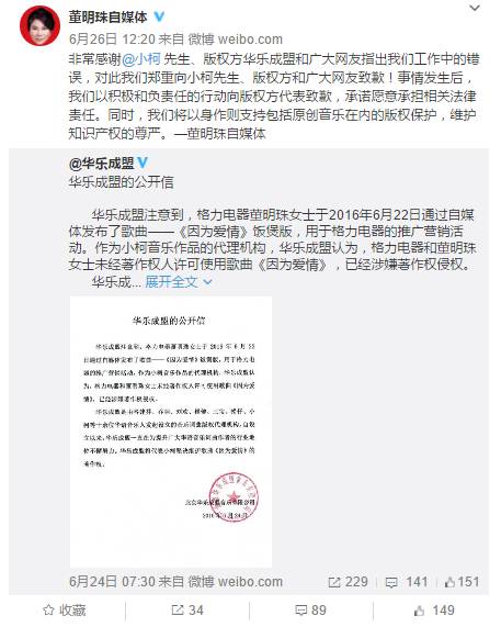 新榜综合报道 6月26日中午, 格力电器董事长董明珠的个人自媒体 “董明珠自媒体”官方微博发表声明,向小柯、版权方和广大网致歉,承诺愿意承担相关法律责任。同时,董明珠自媒体称,将以身作则支持包括原创音乐在内的版权保护,维护知识产权的尊严。