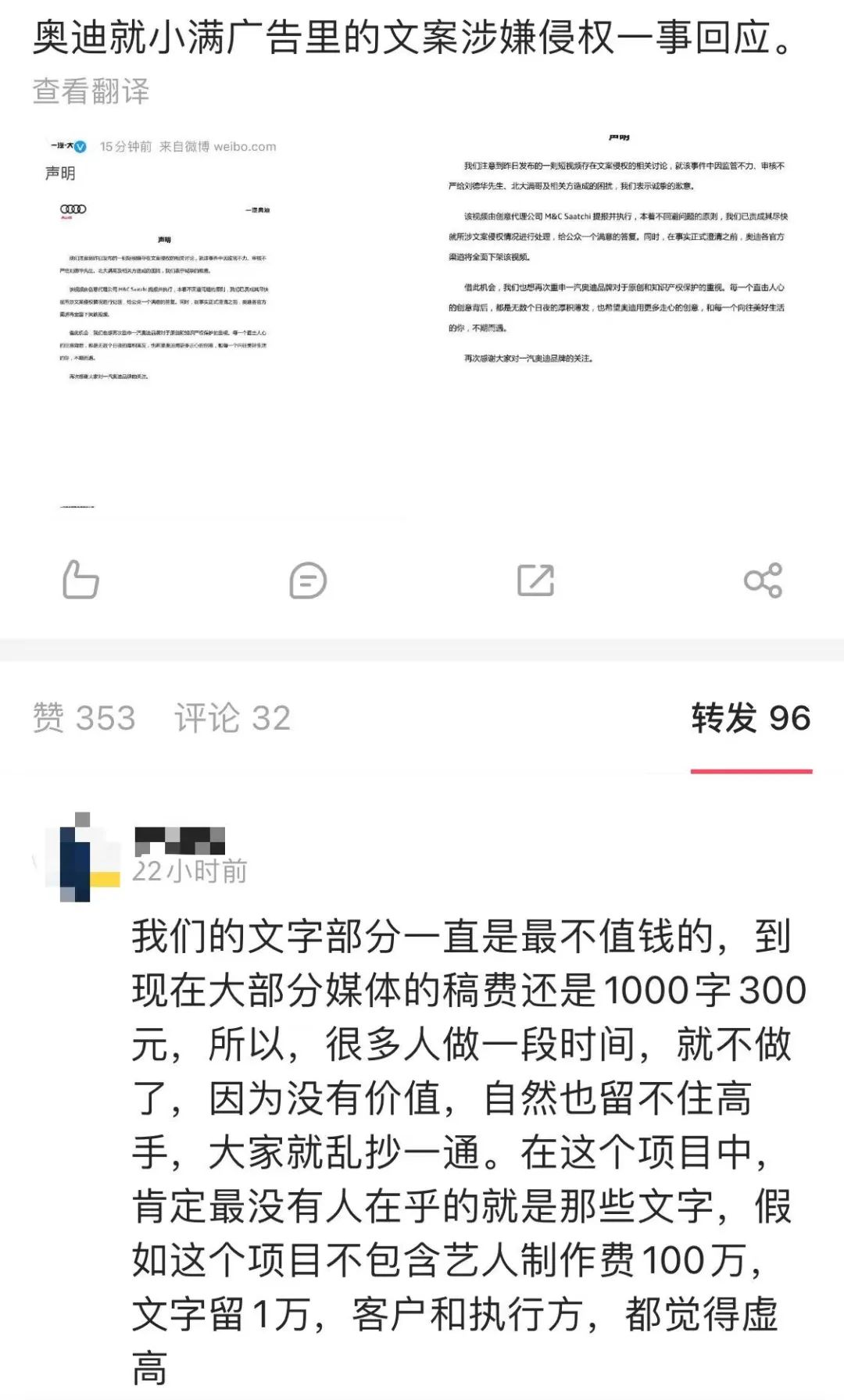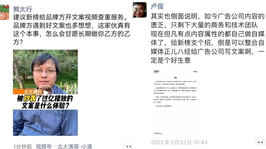 奥迪这条广告之所以毫无疑问地被判定抄袭,是因为文案几乎逐字未改,但在内容行业,更多的抄袭或者说洗稿,是有判定难度的。