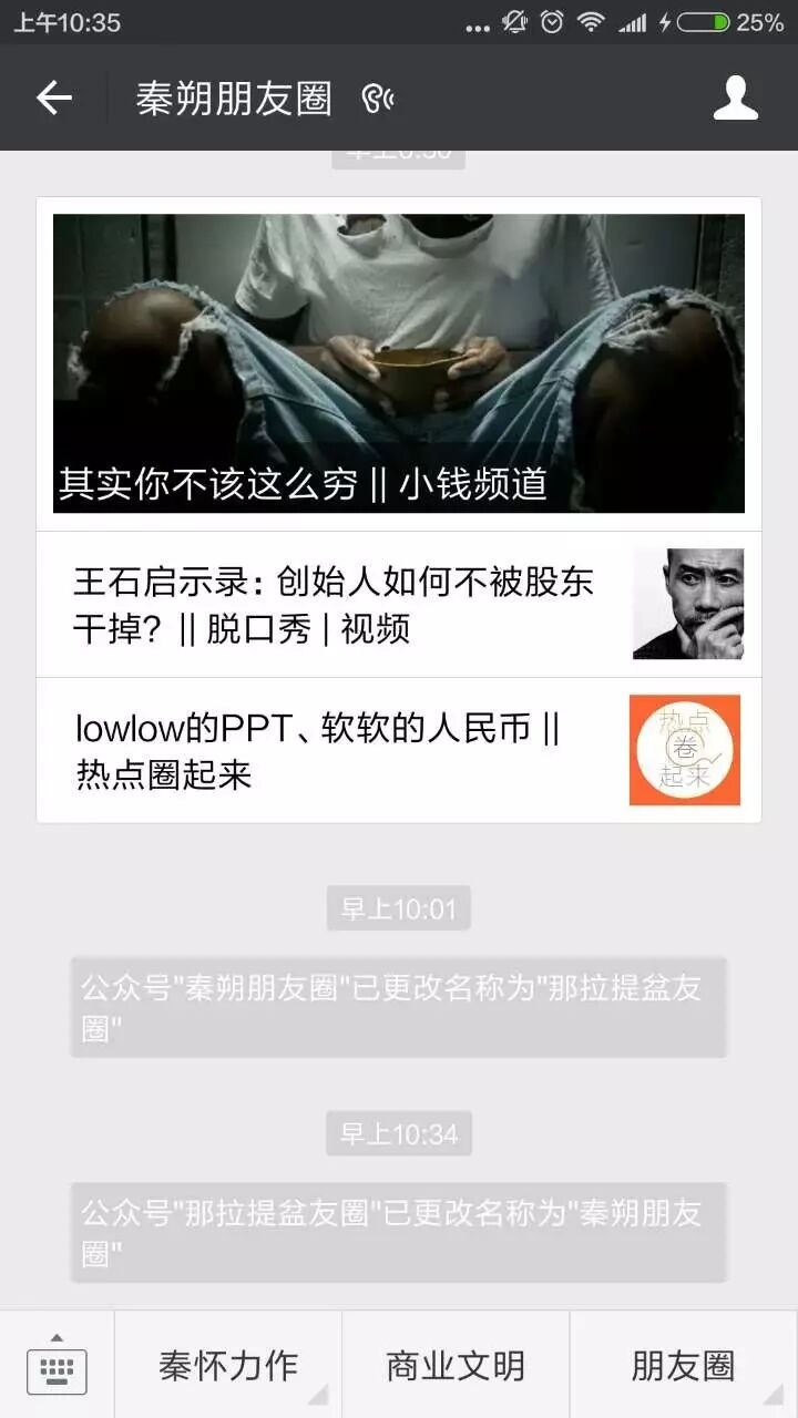 但奇怪的是,半小时后,“那拉提盆友圈”再次更名为“秦朔朋友圈”,如此任性更名,比昨天的“微信卡巴”还壕。毕竟认证过的微信公众号更名需要重新认证,300元/次。