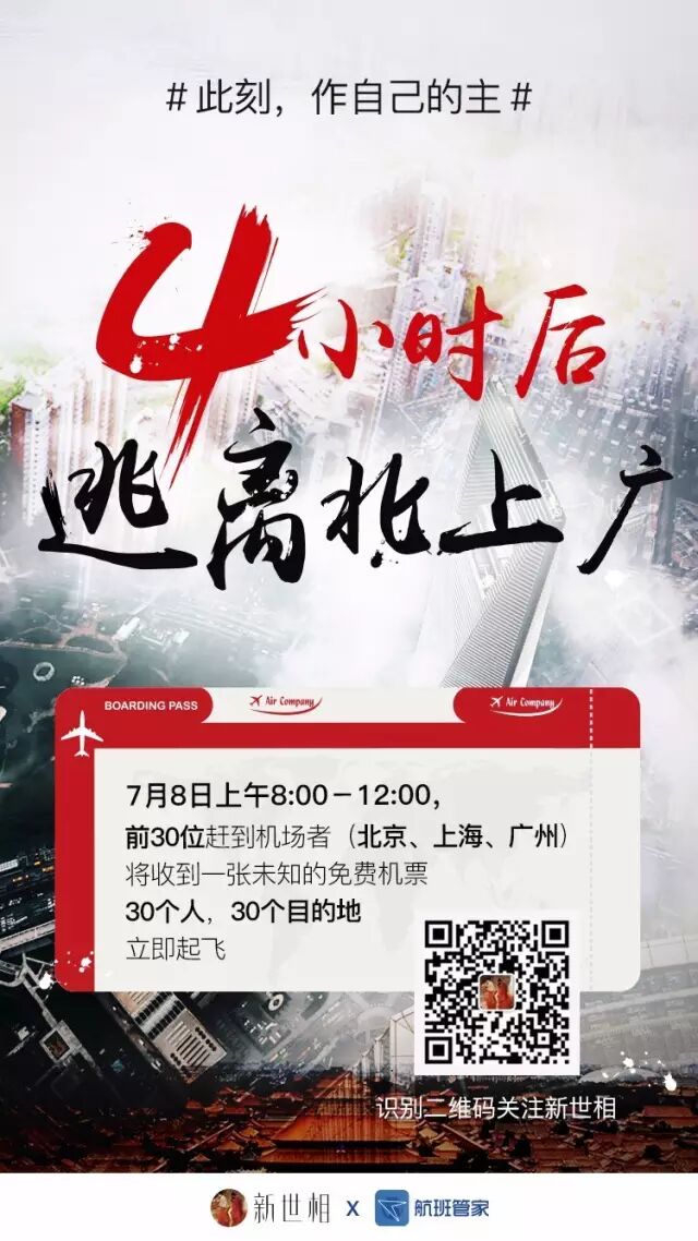 最早赶到机场的30个人(北京14人、上海8个人、广州8人),就能获得世相君提供的免费机票,完成逃离北上广的终极梦想。