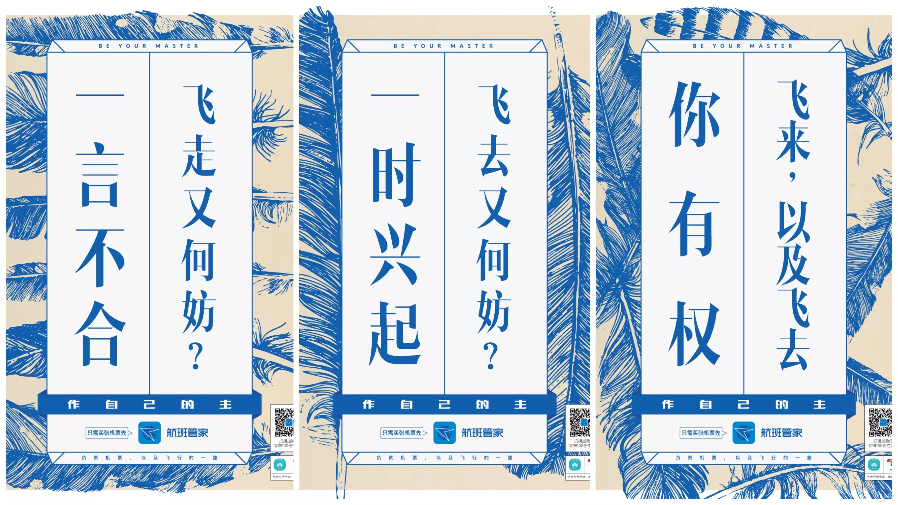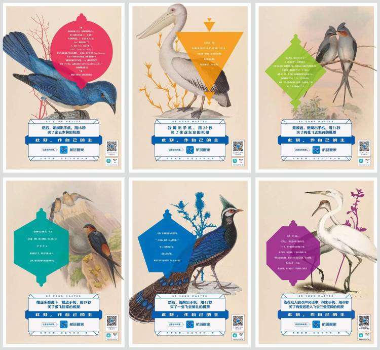 张洪基提到的这套框架广告,正是之前已经在北上广白领人群中引起热议的两组海报,一组是以6只鸟为主视觉,并虚构了珍妮、张勇、王晴朗、王菲菲、小李等几位主角,各自讲述了一个故事,最后不约而同地选择了“掏出手机买了一张机票”。
