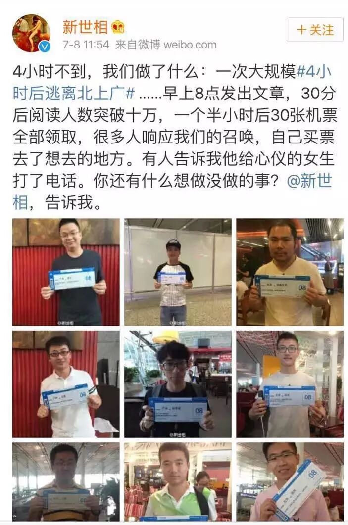 截至下午5点,“新世相”后台收到8万多条留言,其中,按指定要求回复“逃离北京”的有13505人,回复“逃离上海”的有11568人,回复“逃离广州”的有5583人,总计3万多人。也就是说,“新世相”的振臂一呼,有3万多人响应号召,企图逃离北上广,然而,最终实现梦想的只有30个人,且在活动开始后的一个半小时后,30张机票就被全部领取。