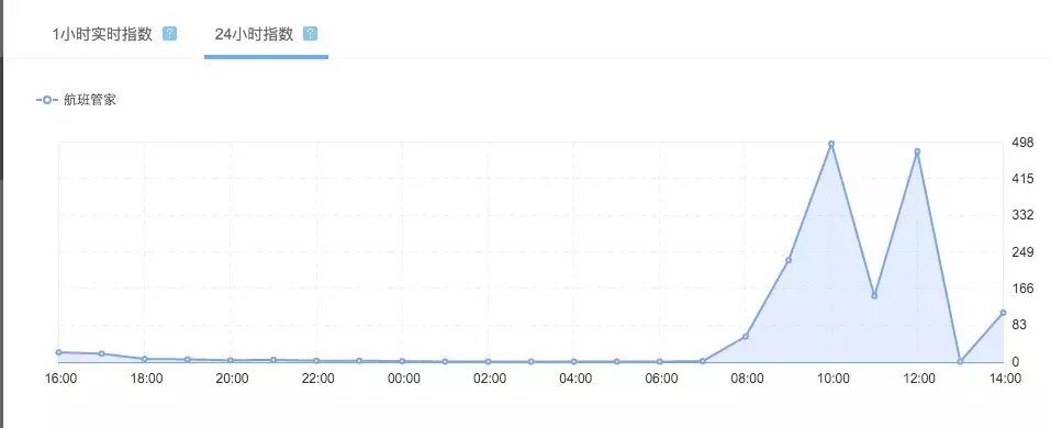 根据微指数的24小时趋势图可以发现,“航班管家”的微博搜索里在今天上午10点和12点达到了两个高峰,搜索量是平日的数百倍。
