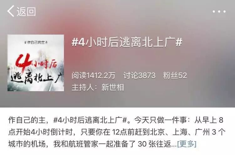 今天一早,朋友圈就被“新世相”的“4小时逃离北上广”活动刷屏了。