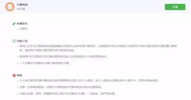 早在去年10月,微信就已内测付费阅读功能,当时流出的一张微信后台截图显示,一个公众号每个月只能申请10篇付费阅读的文章。至于内测的资质要求目前尚不清楚,但应该仍然是已经开通原创保护及相关功能的少数公众号。付费阅读功能的发放,极有可能仍然是由微信官方基于大数据的主动邀请。