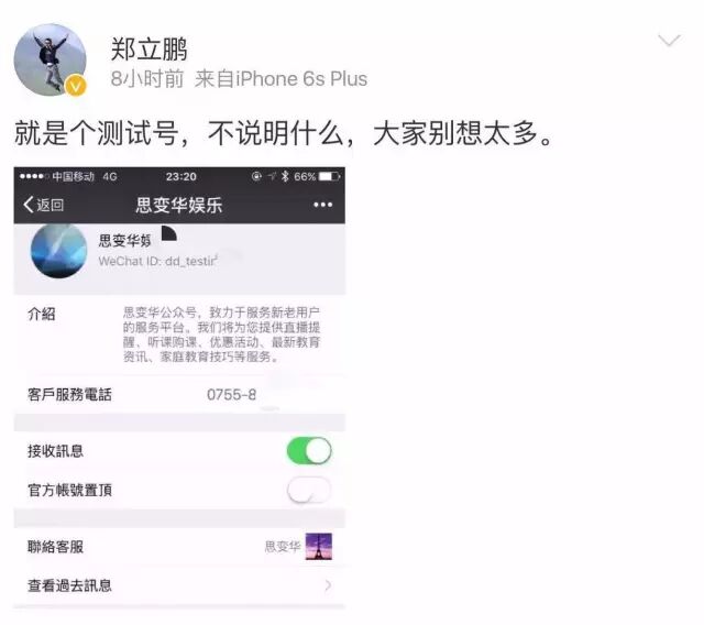 直到昨天凌晨,微博认证为腾讯微信安全风控中心高级总监的郑立鹏发了一条微博,承认“思变华娱乐”是微信旗下的测试号,但其余并未透露任何消息,只说“大家别想太多”。