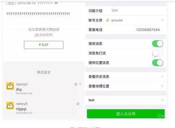 而到了今年年初,付费订阅功能内测的消息再度传出,在一个昵称为“fff”的公众号上,运营者可以选择某一篇图文消息为强制付费才能阅读,并且可设置金额和引导语。当时微信官方也回应了此事,称只是开发者测试。