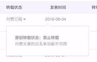 果然,8月4日,就有微信运营者向新榜爆料,在公众号后台的原创声明功能-转载状态栏内,原先的“允许转载”更新为“付费订阅”,点击“付费订阅”则显示“原创转载状态:禁止转载,付费文章的白名单功能不可用。”