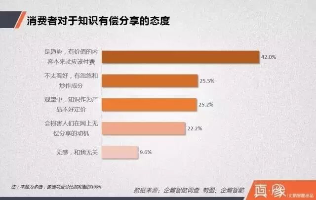 今天,企鹅智酷发布的《知识付费经济报告:多少中国网民愿意花钱买经验?》一文中指出,从消费者对于知识有偿分享的态度来看,超过四成网友认为“是趋势,有价值的内容本来就应该付费”。
