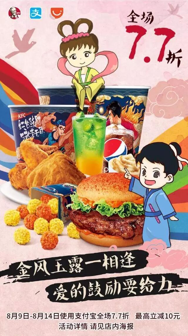 如果说迪奥的营销实在是傲娇+土豪,那么肯德基则显得接地气太多。在七夕前几天,肯德基就高调宣布将与支付宝携手,连续6天狂欢,全程7.7折,也就是说,从8月9日到14日,使用支付宝支付均可享受折扣。最关键的是,此福利面向所有消费者,无论是单身汪还是情侣。