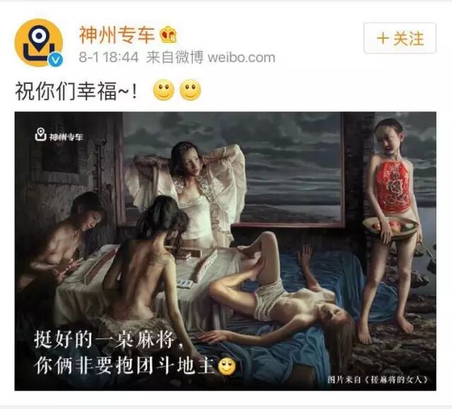 8月初,在经历一系列传闻之后,滴滴和Uber中国终于正式宣布合并。在滴滴和Uber宣布合并的当天,神州专车在微博上发了一张中国画家流溢的《搓麻将的女人》,并配以文案:祝你们幸福。