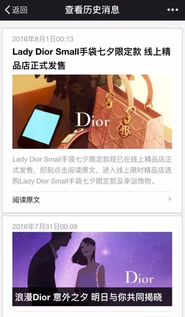 早在七夕前一周多的时间里,迪奥就打出了今年七夕营销方案——四天限时销售限定款手袋。8月1日凌晨,法国奢侈品牌迪奥通过微信公众号发布了一则重磅消息,“Lady Dior Small手袋七夕限定款线上精品店正式发售”, 迪奥成为了第一个在微信上开卖手袋的奢侈品牌。