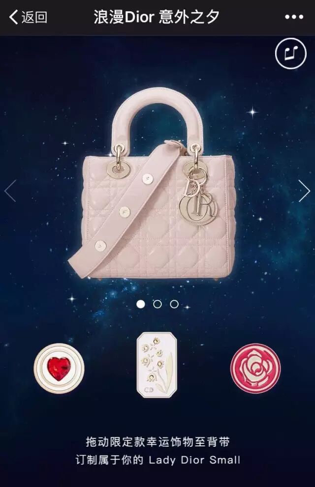 迪奥介绍这款 Lady Dior Small 手袋是为中国七夕情人节特别呈献的,承袭了 Lady Dior 家族的经典线条、标志性藤格纹图案以及“D-I-O-R”字母形状的金属吊饰。不仅如此,这款手袋还开设个性化的定制功能。迪奥将提供肩带上可自由搭配的三种幸运饰物,用户可以直接在线上进行个性化的搭配。