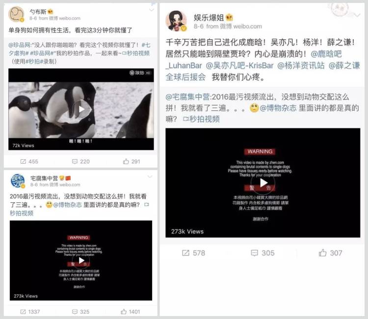 这段视频是名副其实的“污”,因为在这3分多钟里,展现了几十种动物“啪啪啪”的场景,在秒拍平台半天就突破了500万点击量,腾讯视频也获得了47万点击。