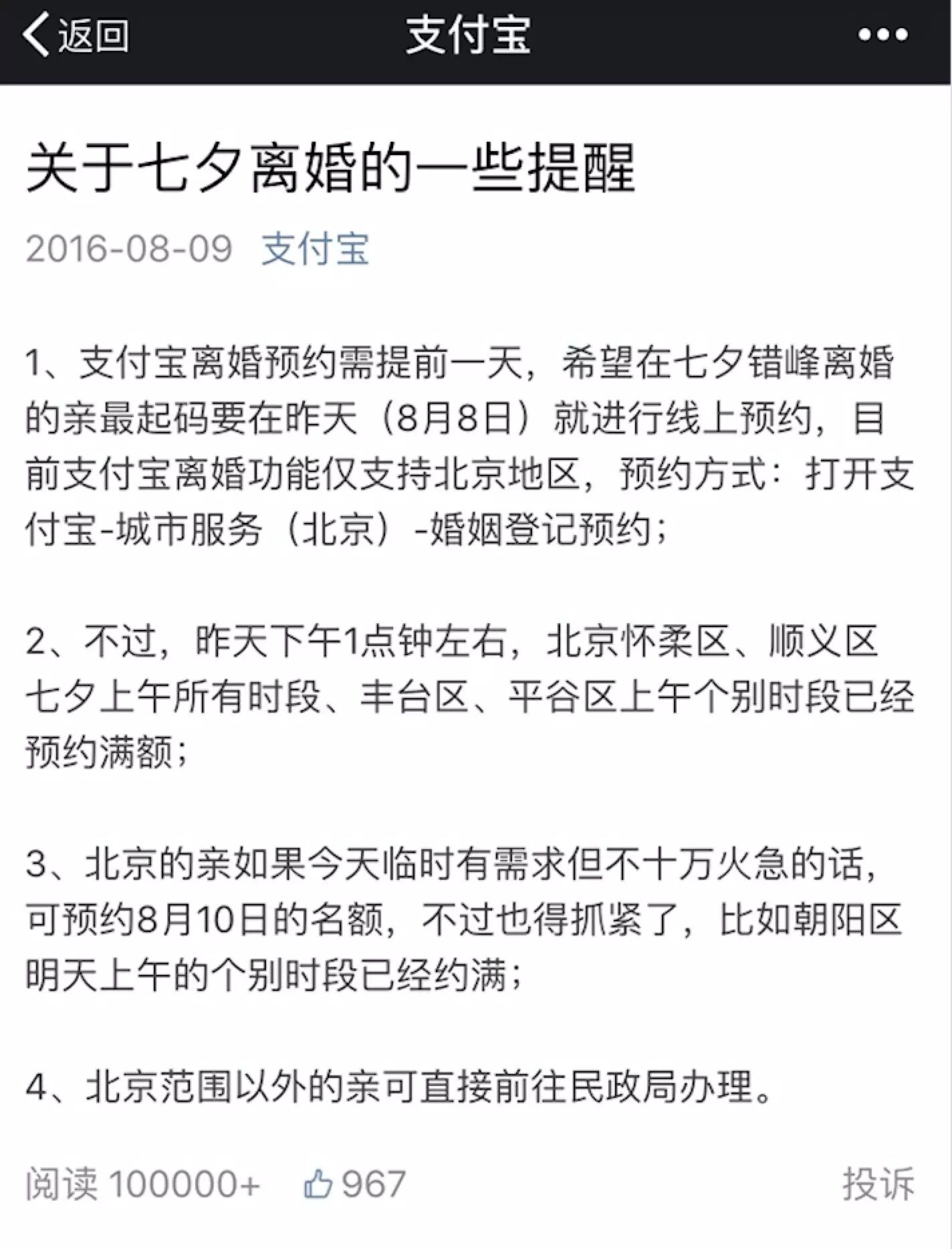“七夕”情人节这一天,支付宝反其道而行之,用一篇10w+爆文宣传了其上线的城市服务之一婚姻登记预约功能。不过,支付宝没有中规中矩描述结婚登记预约,而且很“扫兴”地介绍了离婚预约。不愧是七夕营销中的一股泥石流。
