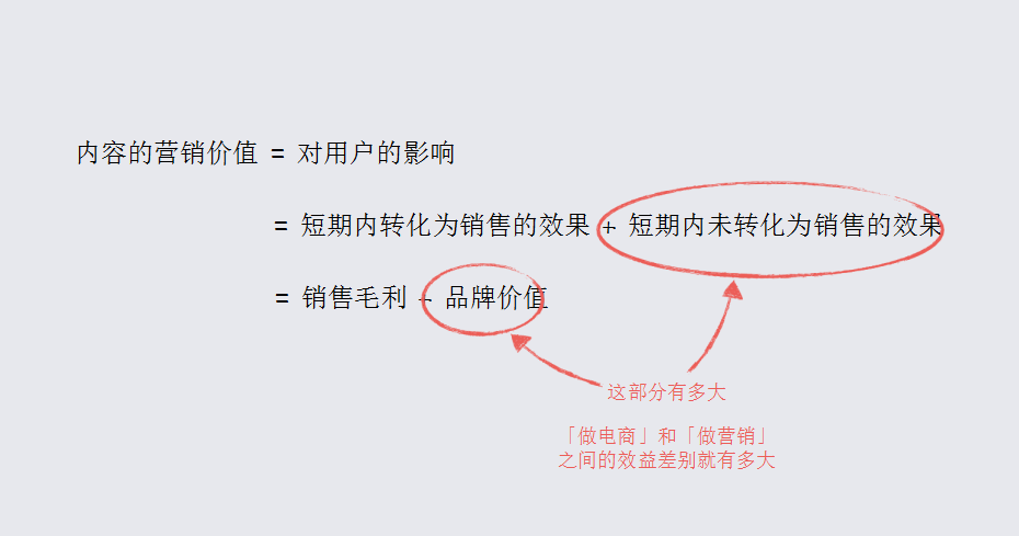 可能你会被电烤箱和吸尘器的例子打动,但很少会有人在两天内就下单把我刚说的这两个产品买回家。但我相信,在未来的某一天,当你想买一个电烤箱或者吸尘器的时候,会想到今天我讲的案例。这就是品牌价值,就是短时间没有转化成销售的营销价值。这部分价值有多大,就意味着你做电商和做营销,能获取的商业价值的差别有多大。也即是说,现阶段这样的内容,我们觉得做电商是不划算的,做营销是划算的,因为有这部分价值在。