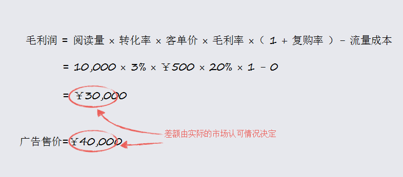 拿一个1万阅读量的文章代入公式来举例,我新推送一篇文章,不需要付出额外的流量成本。但是同样一篇文章,我们做一个广告,我们卖4万,中间差1万,就是短时间内未被转化成销售的价值。