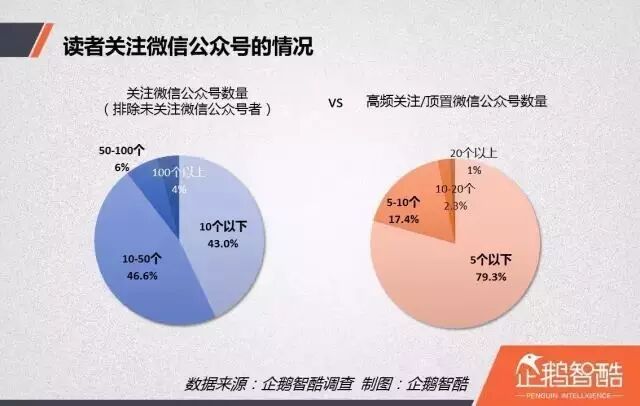 近日,企鹅智酷发布《自媒体读者行为洞察报告》,其中指出,从数量上看,关注10-50个公众号的网友占比最多,达46.6%,其次是关注10个以下者,占43%。关注50个以上公众号者仅占10%。近八成网友高频关注或者顶置的公众号不超过5个。
