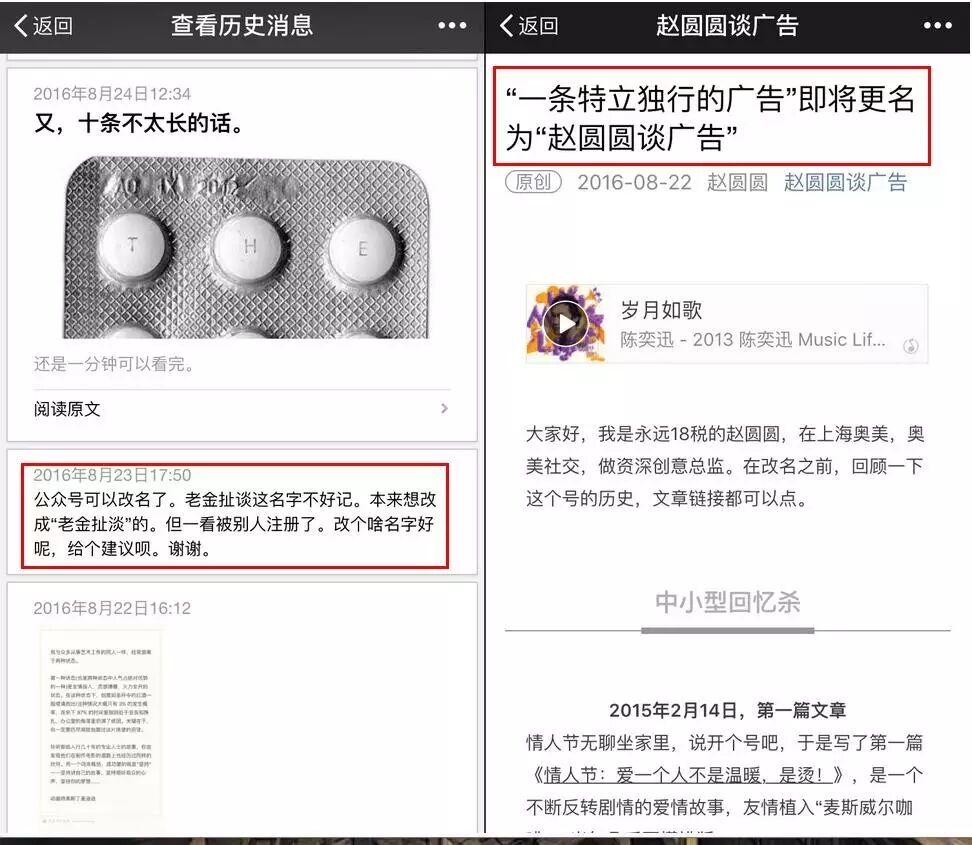 “公众号可以改名了。老金扯谈这名字不好记。本来想改成‘老金扯淡’的。但一看被别人注册了。改个啥名字好呢,给个建议呗。”大家对改名热情很高,杜蕾斯营销的操盘手金鹏远在自己公众号里群发了改名征集贴,奥美资深创意总监的个人公众号也在8月22日正式更名,由原来的“一条特立独行的广告”改为“赵圆圆谈广告”,更加直接且个人化。