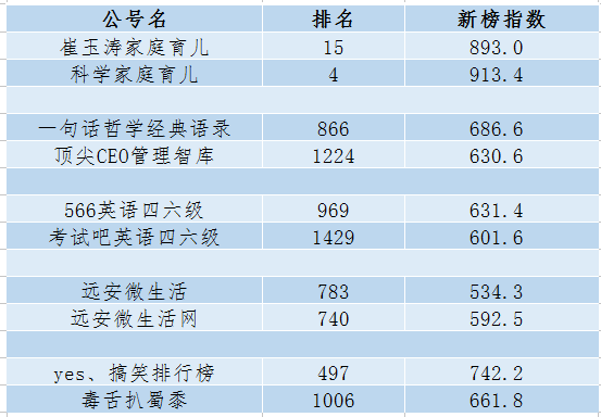 如图,“科学家庭育儿”经历改名,新榜指数和排名都有所上升,“远安微生活网”在改名后,阅读量也有所提升,新榜指数也升了。另外3个账号“顶尖CEO管理智库”“考试吧英语四六级”“毒舌扒蜀黍”则不增反降,但榜妹认为这3个账号改后的名字相较以前反而是更加简单明了有个性了。目前,通过微信搜索这些账号的原名,依然能找到改名后的公众号,即使名字和搜索关键词差异很大。