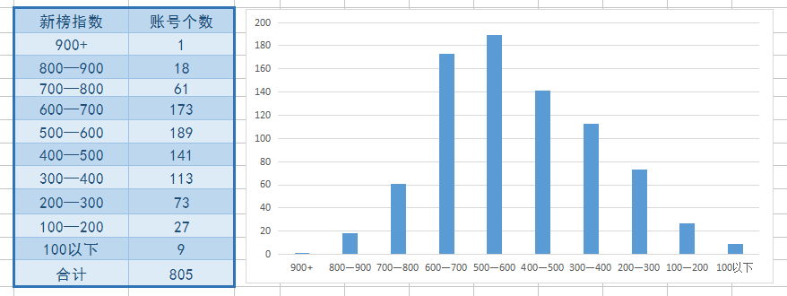 ▲ 账号的新榜指数分布图