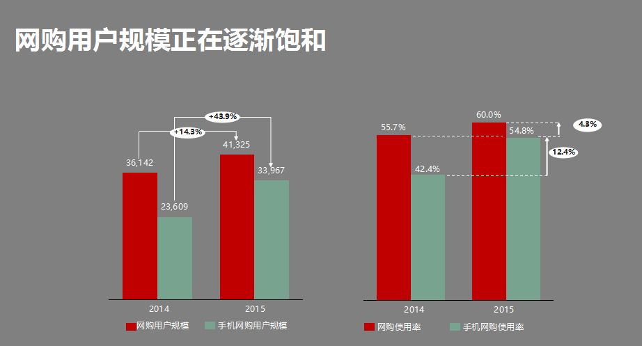 从网购用户规模来说,同比增长其实是比较低的数,尤其在PC端,因为整个网购的渗透率已经很高。大家也许会说还有40%或50%的成长空间,但要另外40%或50%的用户要发展成网购用户,所需要投入的精力跟成本,相对于此前的红利期都是非常高的。今天我们经常听到京东、淘宝要攻坚农村电商,但以前我们没怎么听到过城市电商这个词。因为相比农村用户,把城市用户发展成网购用户难度要低很多。
