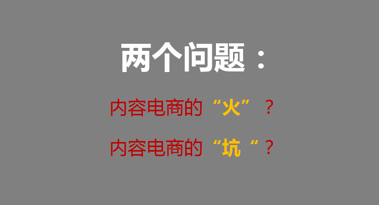 今天我主要谈两个问题,内容电商的“火”,主要是它背后的商业逻辑是什么?内容电商的“坑”,主要关于内容电商可能会碰到哪些坑?这两个凸显的字连起来就是“火坑”,如果没有思考清楚电商,很有可能会埋葬掉你的内容创业。