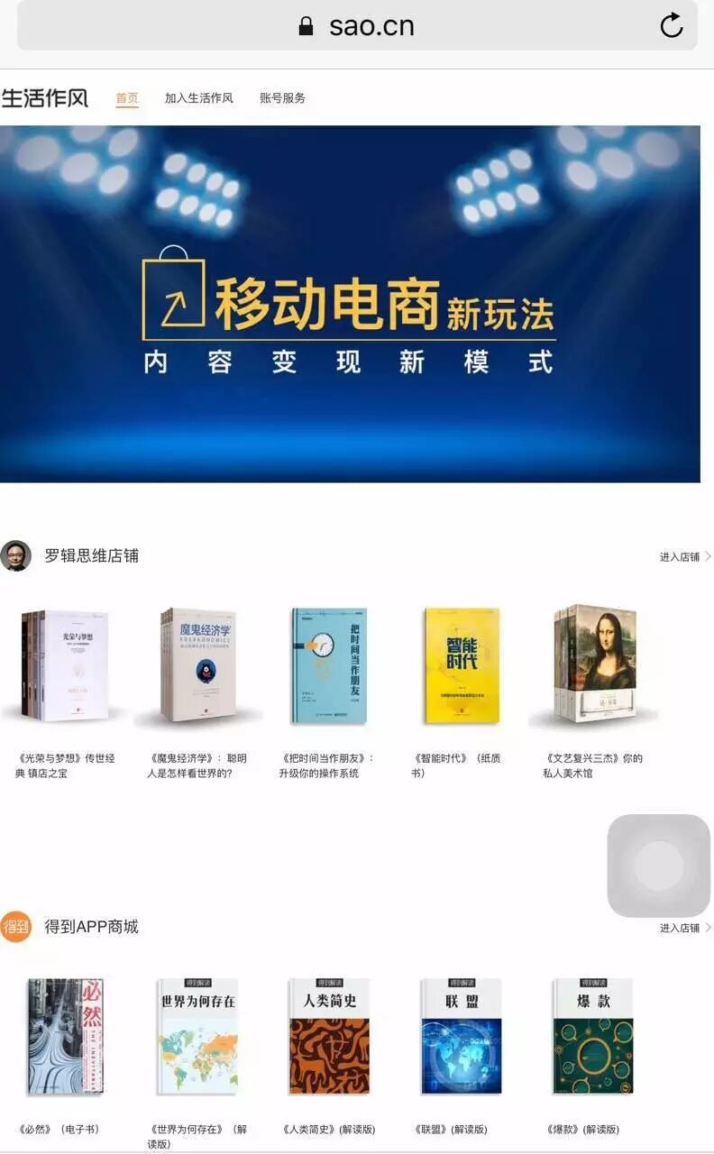 每次大动作之前的造势为行业贡献了诸多解读新媒体的概念,在魅力人格体和社群电商之后,“知识付费”成为罗振宇扛起的新一杆大旗,新的独立商城“生活作风”悄悄上线,启用新域名sao.cn,继得到App之后,罗振宇再次用实际举动证明了“罗辑思维”向知识服务供应商战略转型的决心。