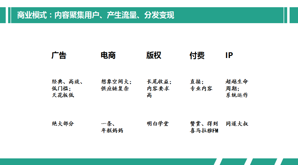 创业者想知道,投资人也想知道,甚至埋头码字的小编也想知道,因为这关乎涉及数十万乃至上百万人的未来。我们所有谈到的以微博、公众号、头条号等等平台为根基的内容创业者,其商业模式理论上包括广告、电商、版权、增值服务等几种,但实际上,目前最行之有效的依旧还是广告。在内容创业浪潮中,第一波赚到千万级别的身家的也基本上是靠广告。