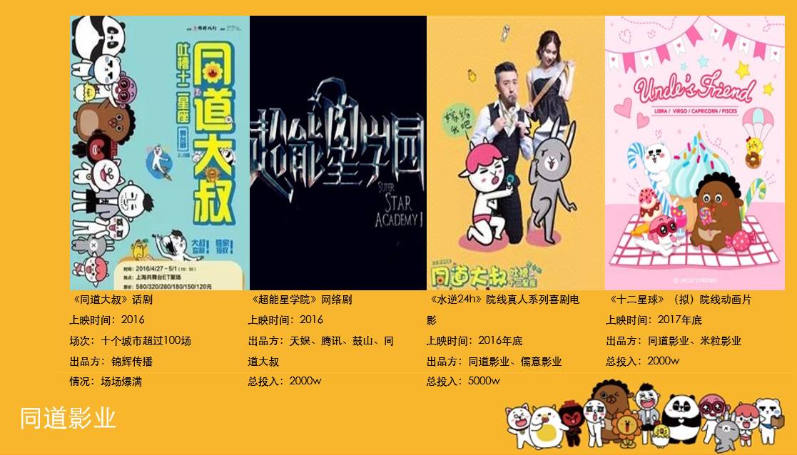 我们还可能是在谈一个泛娱乐集团公司——同道文化集团。旗下包括道仔传媒、同道生活、同道影业等子公司,经营新媒体营销、出版、衍生品、电商、话剧等业务。2015年营收达到5000万元。