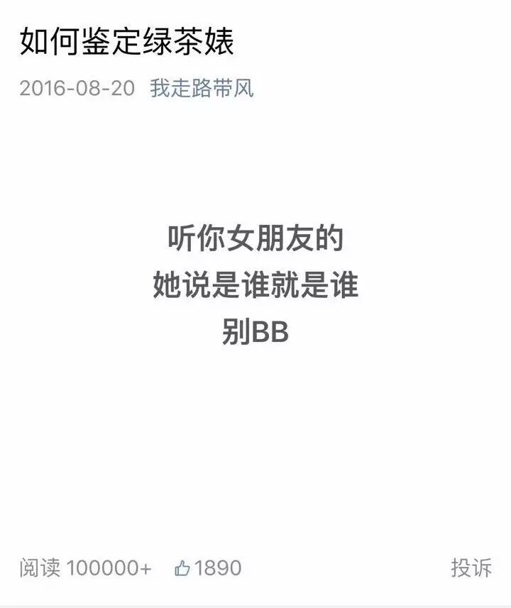 二条的“风声”和三条的“干货”都是“我走路带风”尝试和粉丝互动、让粉丝有参与感的努力。其精髓在于话题的选择,既要让粉丝有话可说,又要有趣,同时还要是同龄人身边有大概率发生的事情,只有这样才能引发共鸣。例如8月20日“干货”发布的《如何鉴定绿茶婊》这篇内容,打开之后是这样的: